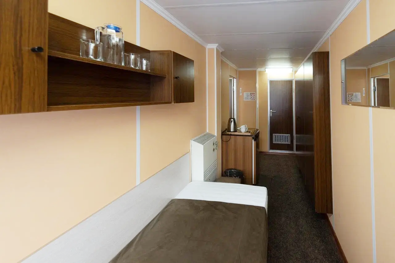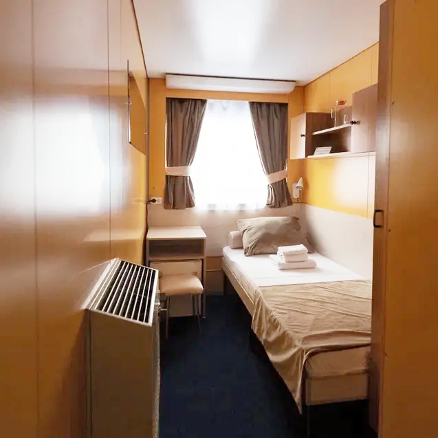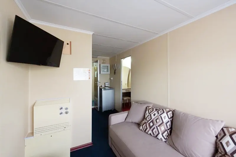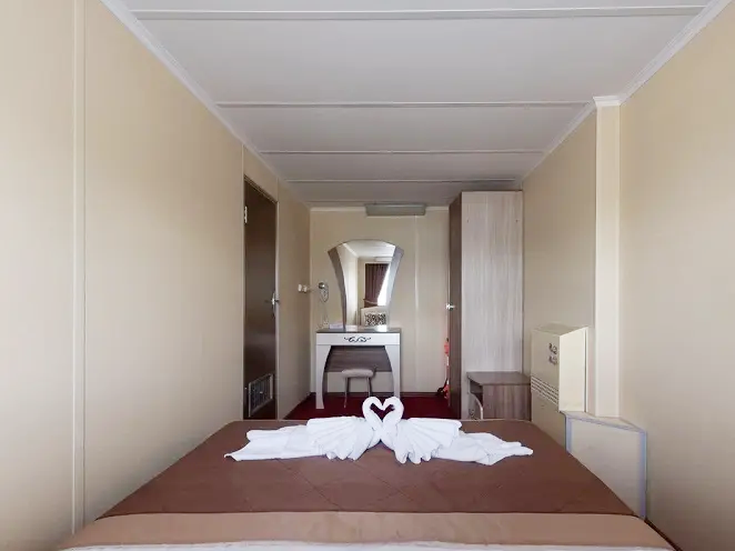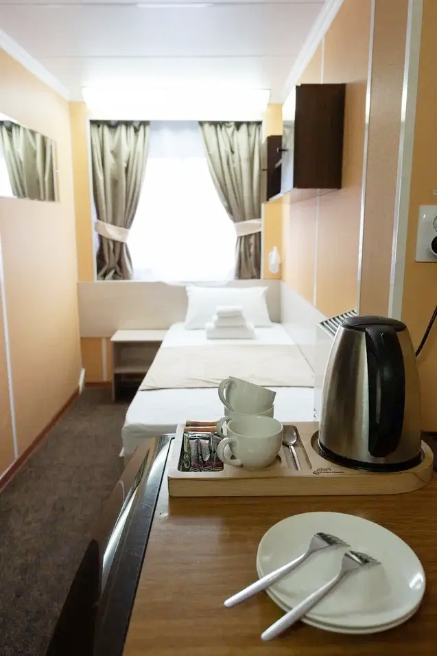 В каюте имеются: 3 кровати , Шкаф для одежды , Иллюминатор , Холодильник , Электророзетка , Радио , Кондиционер , Туалет , Душ , Зеркало ;