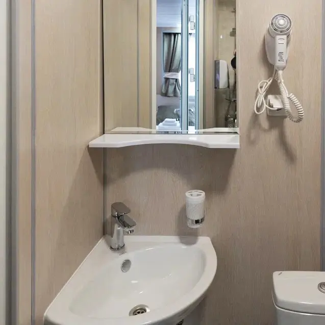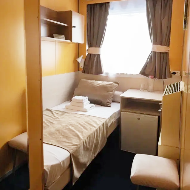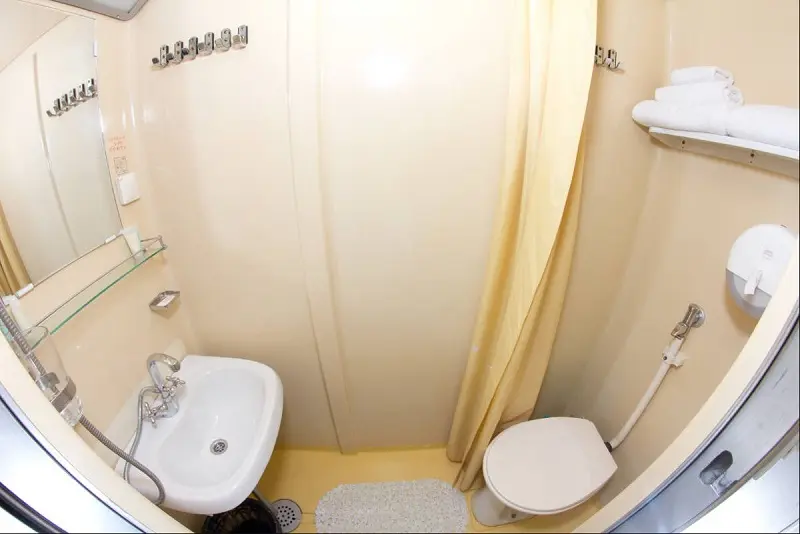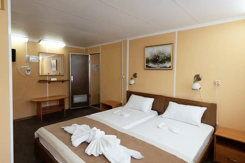 В каюте имеются: 2 кровати , Шкаф для одежды , Холодильник , Электророзетка , Радио , Кондиционер , Туалет , Душ , Умывальник с холодной/горячей водой , Зеркало ;