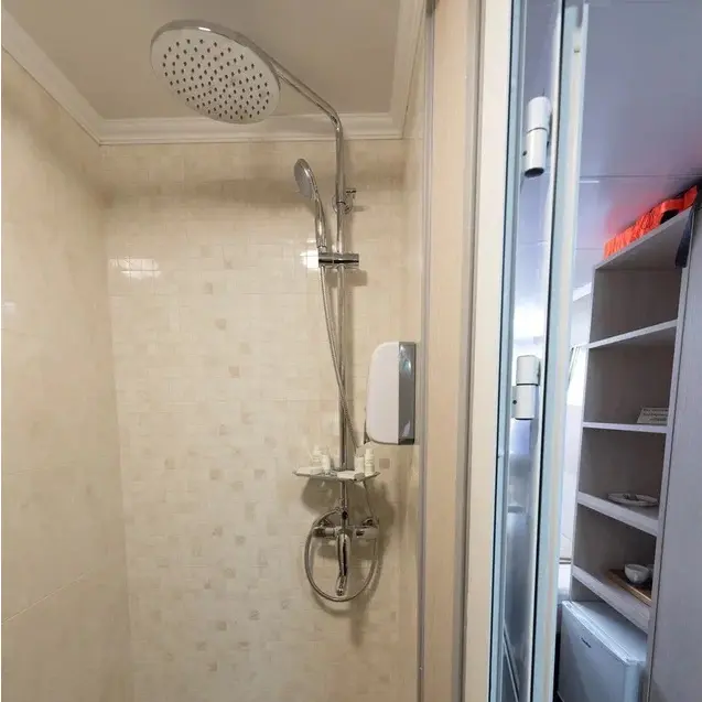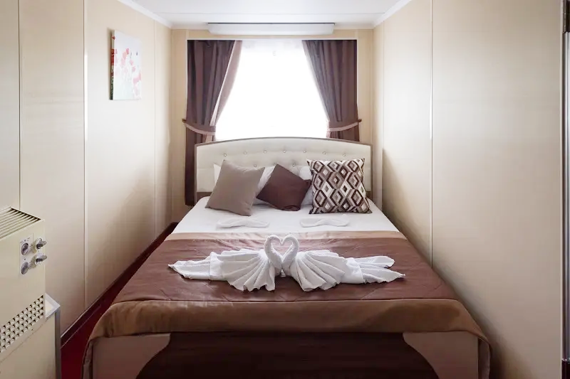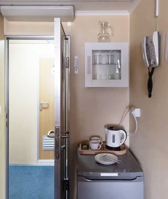 В каюте имеются: 2 кровати , Шкаф для одежды , Обзорное окно , Холодильник , Электророзетка , Радио , Кондиционер , Туалет , Душ , Зеркало ;