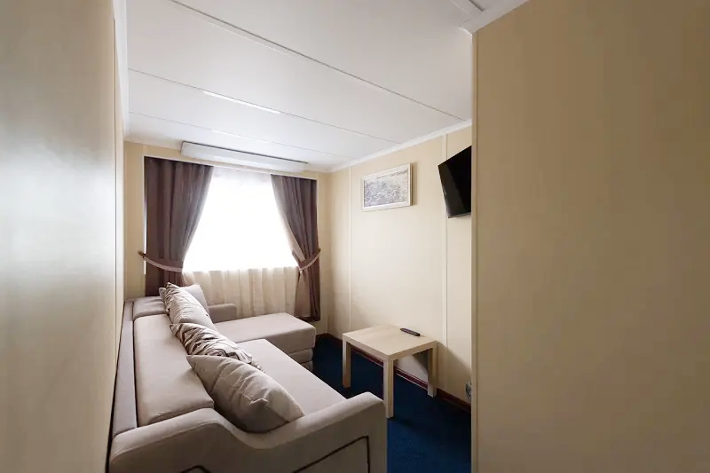 В каюте имеются: Двуспальная кровать , Диван , Шкаф для одежды , Столик , Кресло , 2 обзорных окна , Холодильник , Электрочайник , Электророзетка , Радио , Телевизор , Кондиционер , Туалет , Душ , Зеркало ;