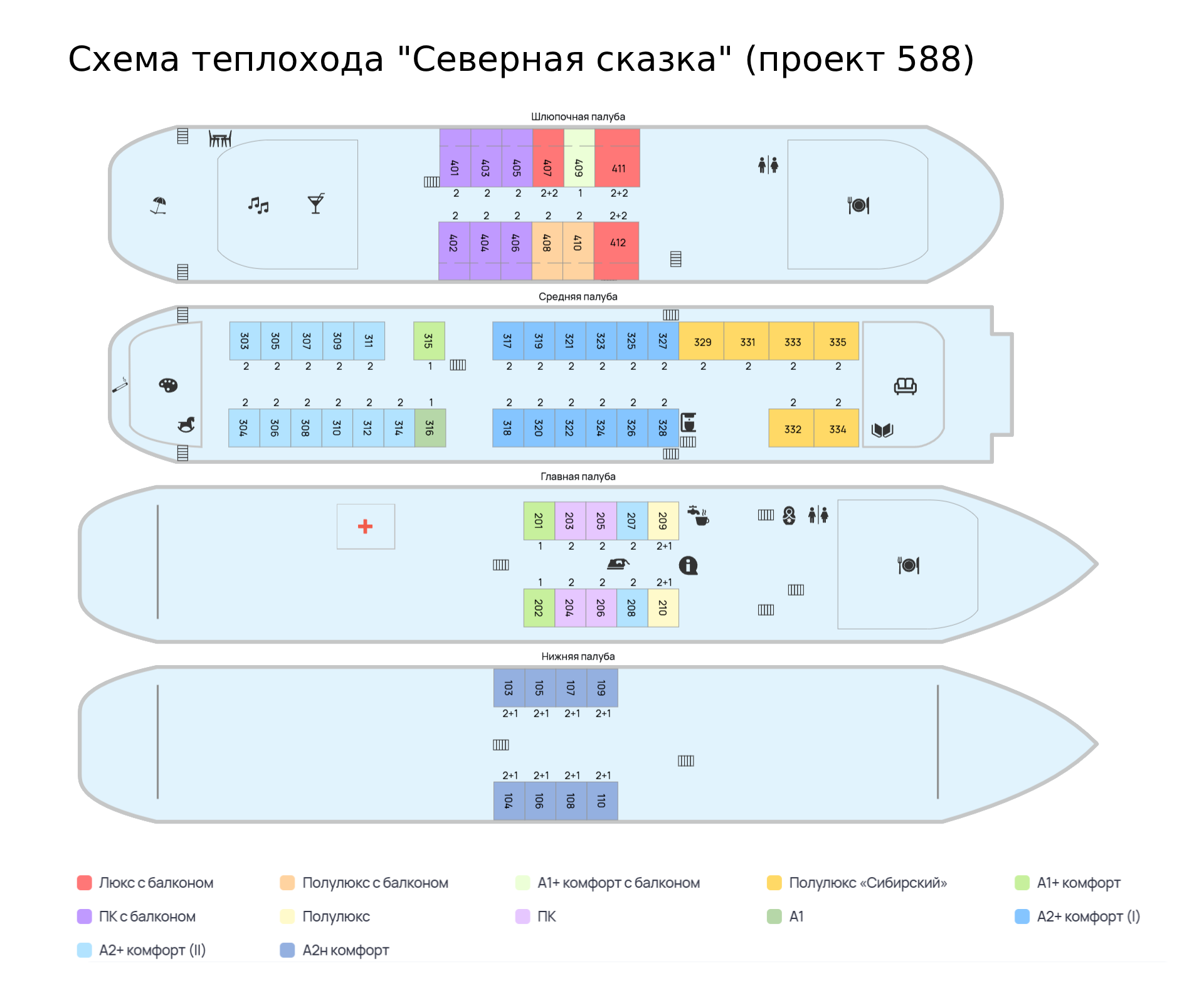 К категории Полулюкс «Сибирский» относятся каюты: 329, 331–335.