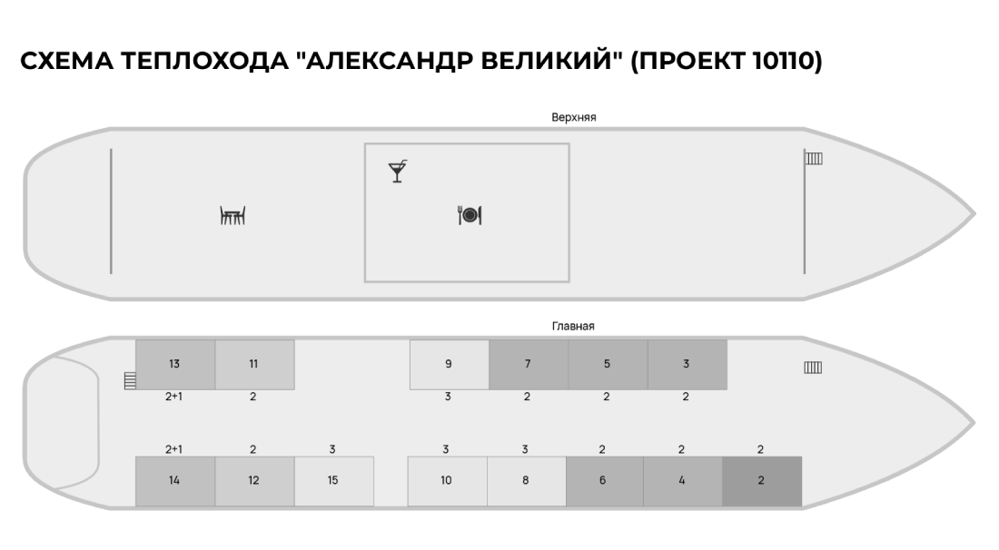 • 15% - дети до 12 лет (включительно) при размещении в каюте с родителями. Скидка действует на занимаемое место. Не суммируется с акциями и другими скидками.