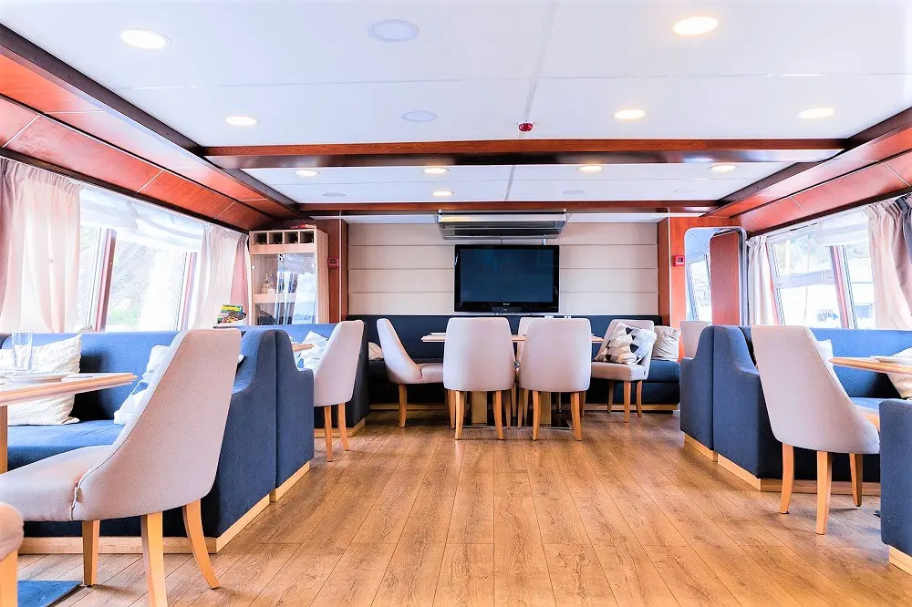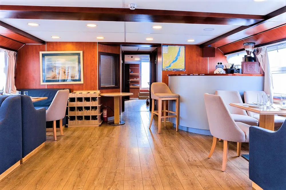 После полной реновации в 2018 году теплоход оснащен современными навигационными системами и предлагает высокий уровень комфорта для 31 гостя. На борту находятся 14 удобных кают, ресторан с трехразовым питанием (включая блюда из байкальского омуля) и бар. Панорамные окна и открытая терраса позволяют наслаждаться живописными видами.