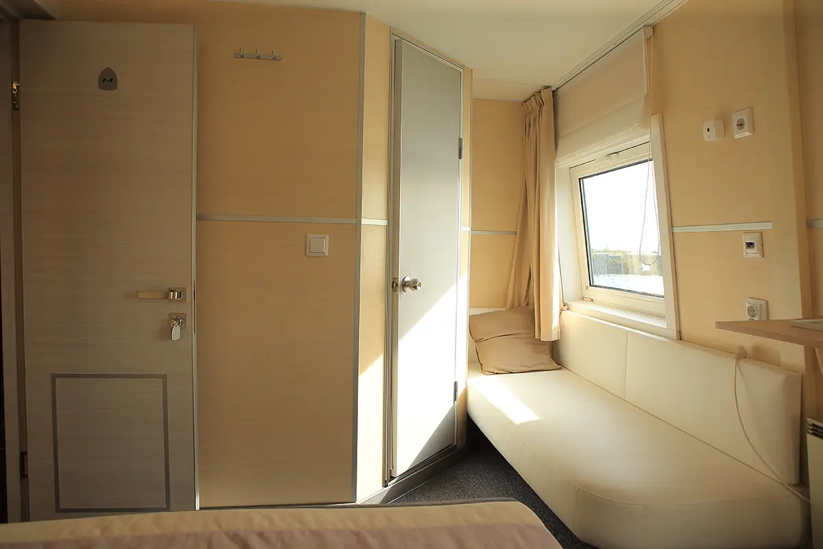 В каюте имеются: Двуспальная кровать , Шкаф для одежды , Столик , Электророзетка , Туалет , Душ , Умывальник с холодной/горячей водой , Зеркало , Фен , Обзорные окна ;