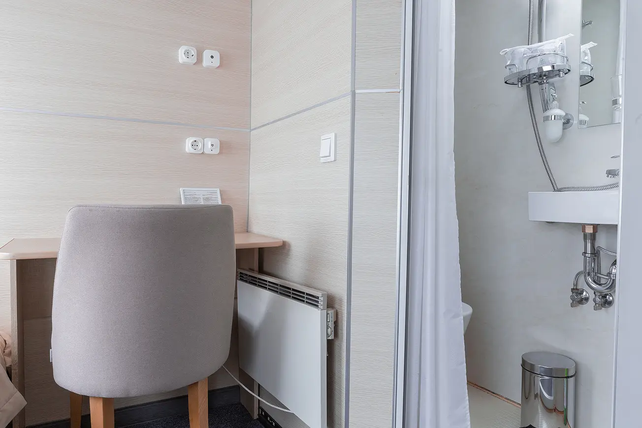 В каюте имеются: 2 кровати , Шкаф для одежды , Столик , Электророзетка , Туалет , Душ , Умывальник с холодной/горячей водой , Зеркало , Фен , Обзорные окна ;