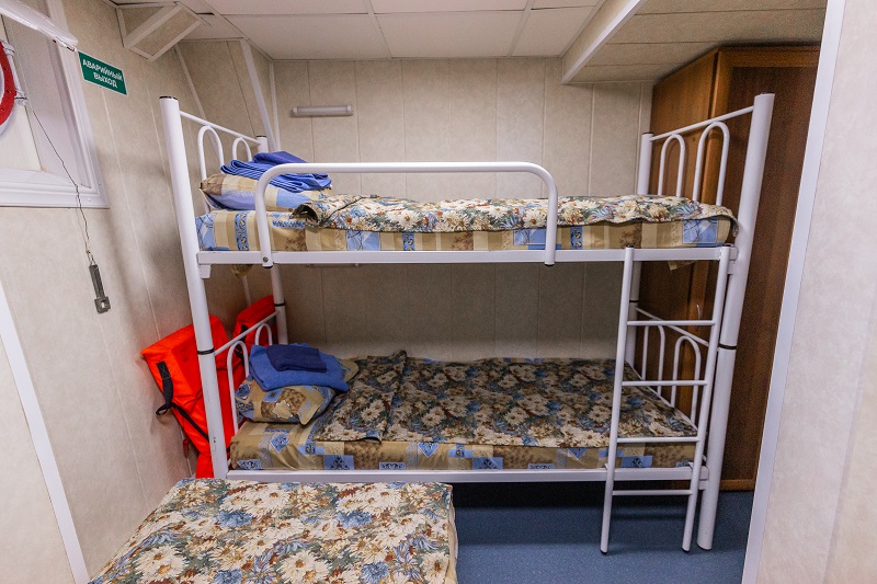 В каюте имеются: Кровать , Шкаф для одежды , Столик , Стул , Иллюминатор , Электророзетка , Радио , Туалет , Душ , Умывальник с холодной/горячей водой , Двухъярусная кровать , Зеркало ;