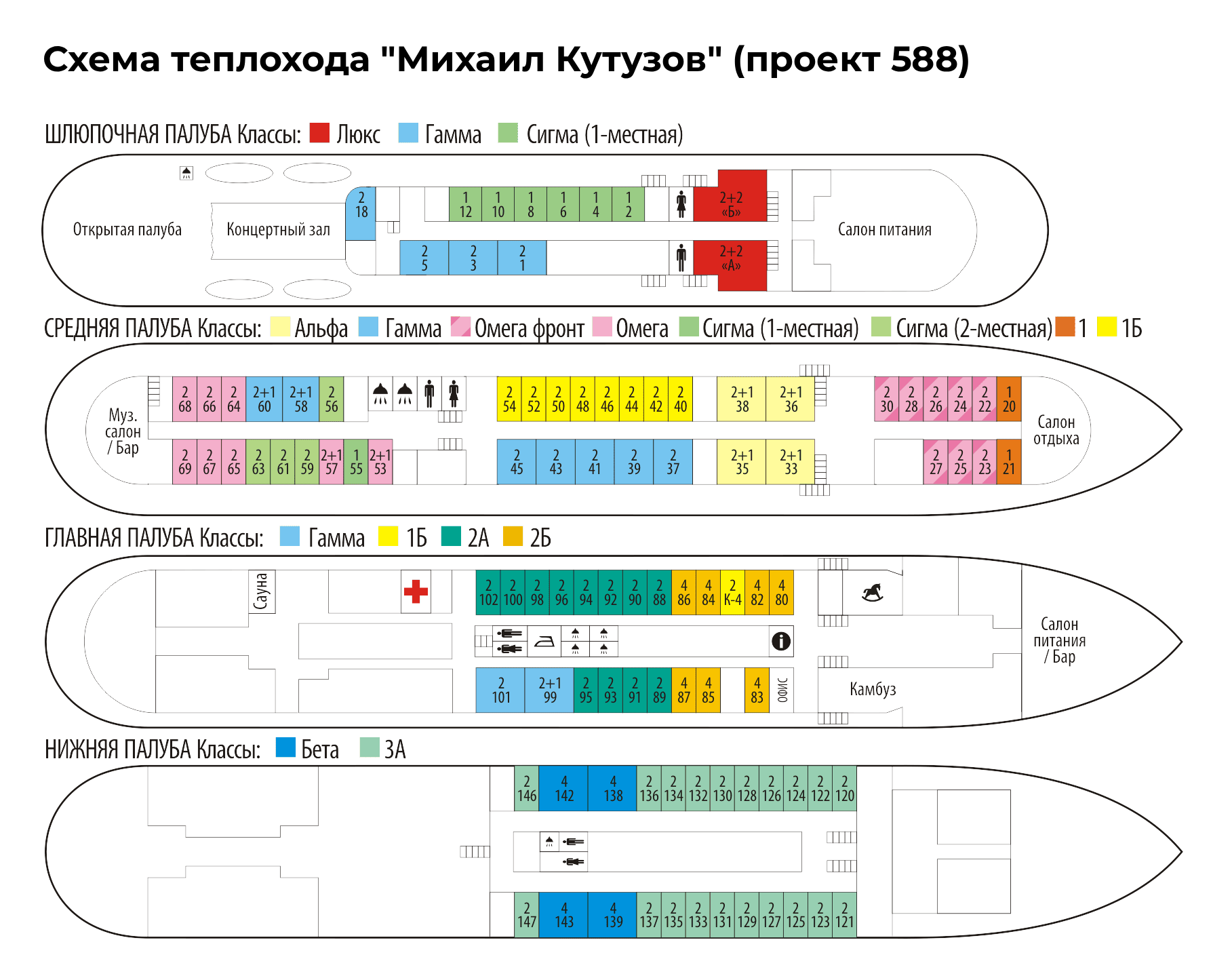 Каюты с частичными удобствами: 1 класс, 1А, 1Б, 2Б, 2А, 3А.