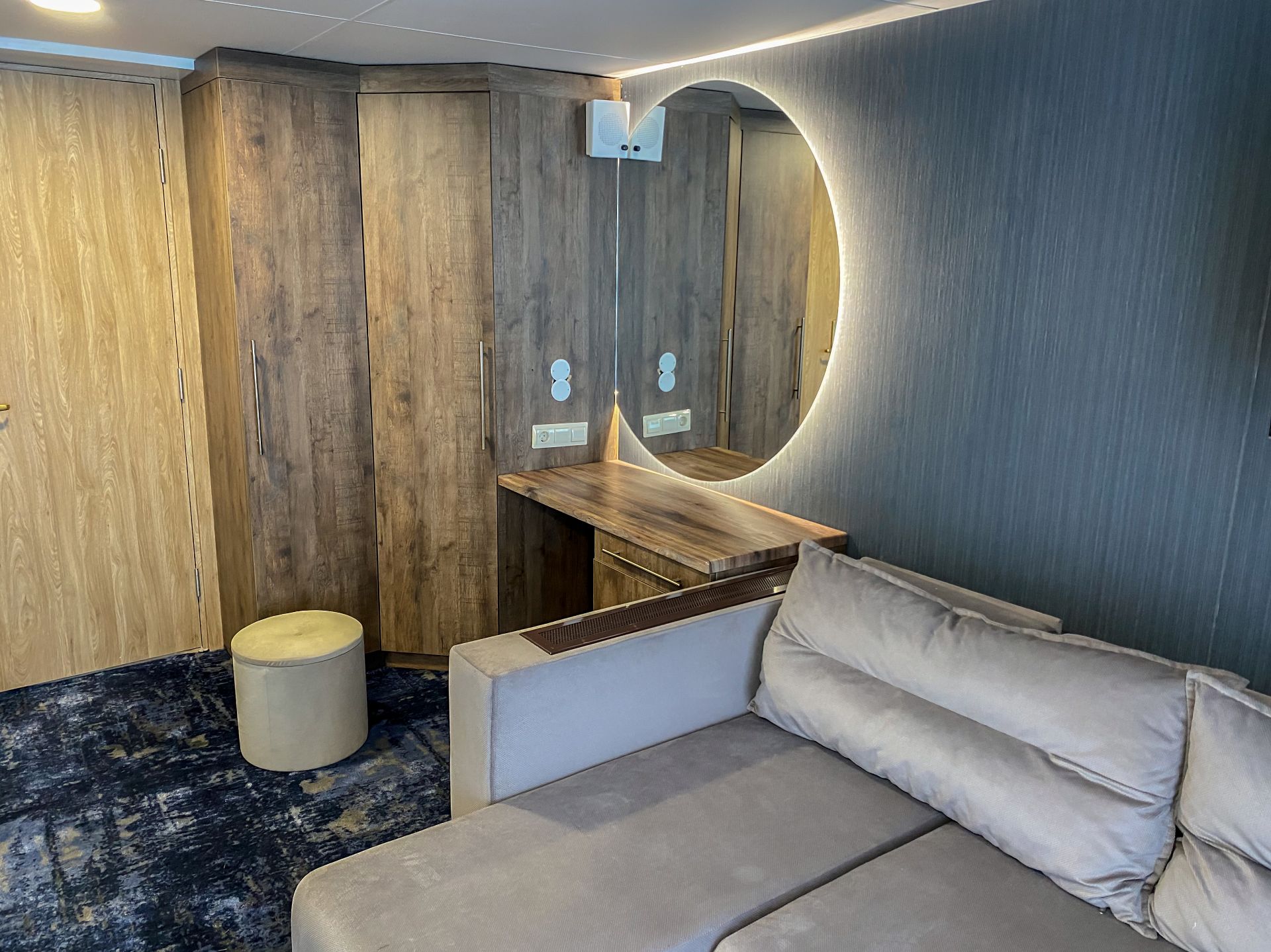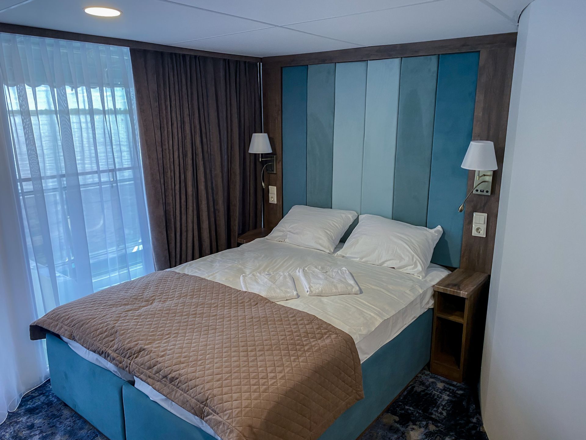 - Уютные каюты с двуспальными кроватями (возможны варианты с раздельными), кондиционерами, холодильниками, сейфами и собственными ванными комнатами.