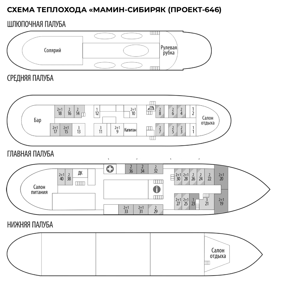В каюте имеются: 2 кровати , Иллюминатор , Электророзетка , Кондиционер , Туалет , Душ , Умывальник с холодной/горячей водой , Зеркало , Доп. место (ярусное откидное) ;