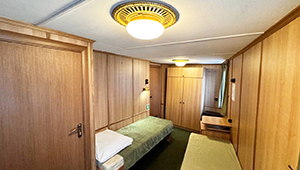 В каюте имеются: 2 кровати , Обзорное окно , Холодильник , Электророзетка , Кондиционер , Туалет , Душ , Умывальник с холодной/горячей водой , Зеркало ;