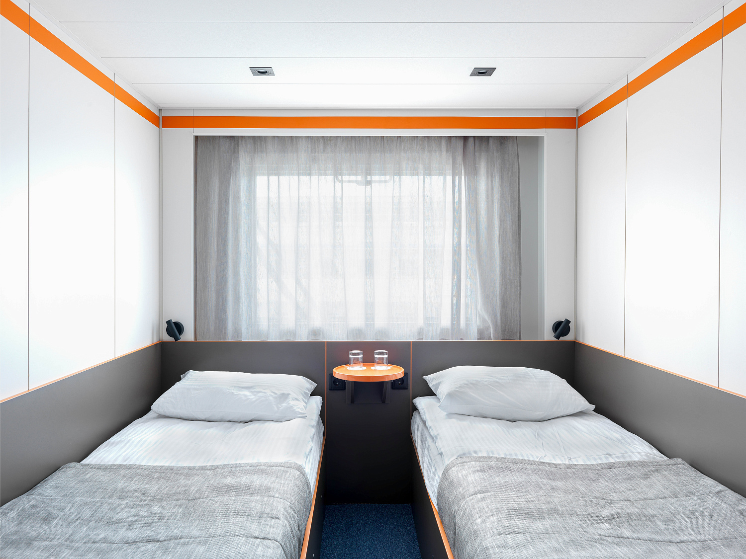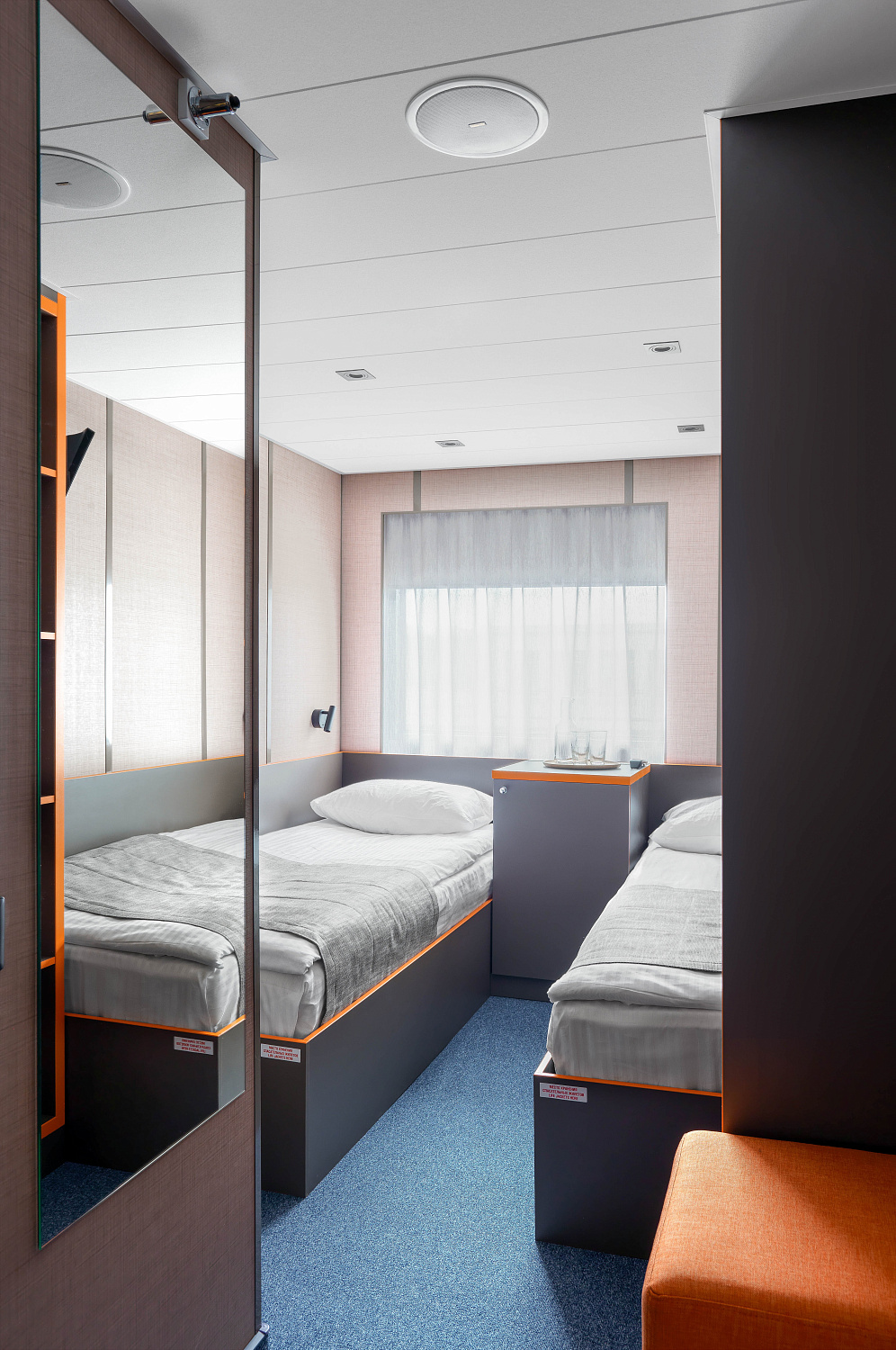 - В каютах №: 401, 402, 404, 410, 411, 431-434, 319-322, 339, 340, 345, 346, 365, 366, 369, 370 - две односпальные кровати.