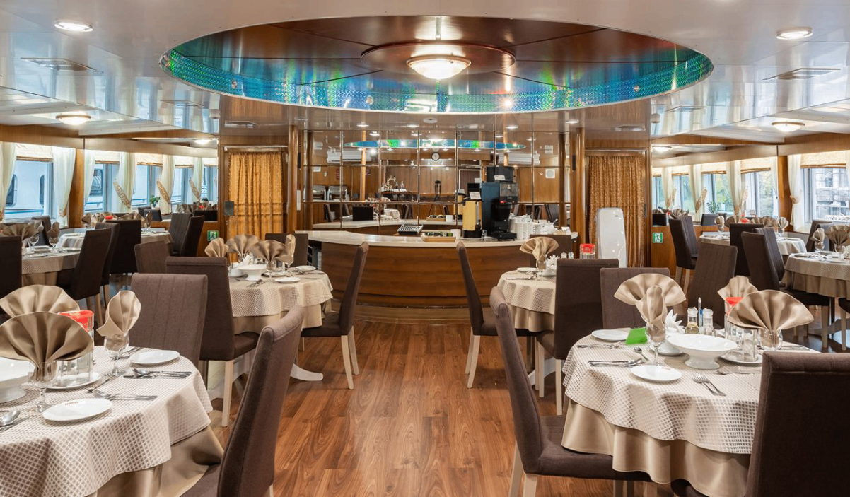 Теплоход является плавучим пансионатом и предлагает следующие услуги: массаж, лечебную физкультуру, фиточай, кислородные коктейли и др. Питание организованно в 2 смены. Завтрак – шведский стол. Обед и ужин – заказное меню.