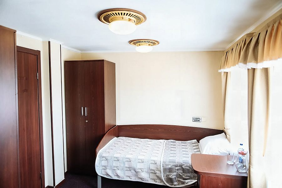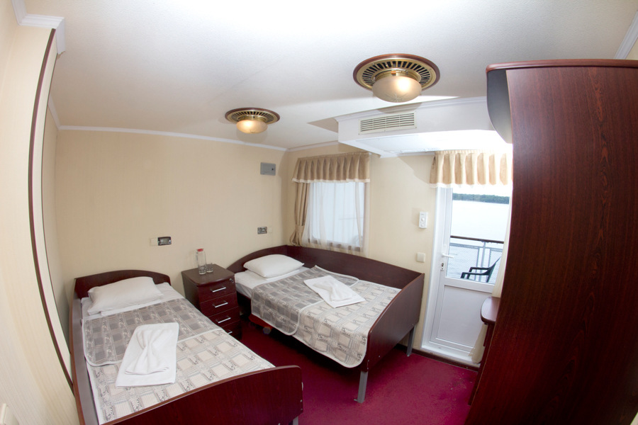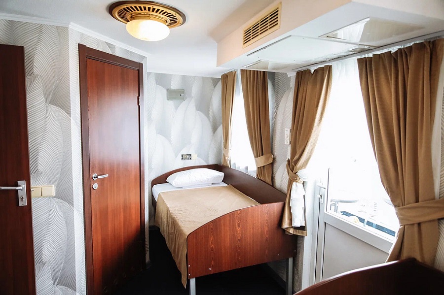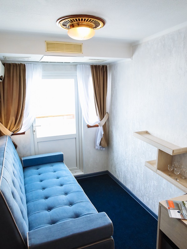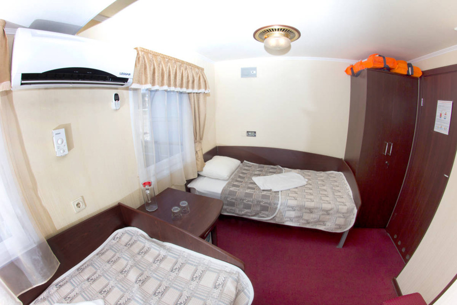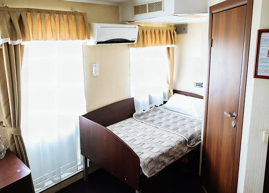 Все каюты теплохода, вне зависимости от их категории, оборудованы сан.узлами и душевыми, радио, холодильниками и кондиционерами. Каюты имеют современные интерьеры и новую мебель. На шлюпочной палубе каждая каюта имеет выход на индивидуальный балкон.