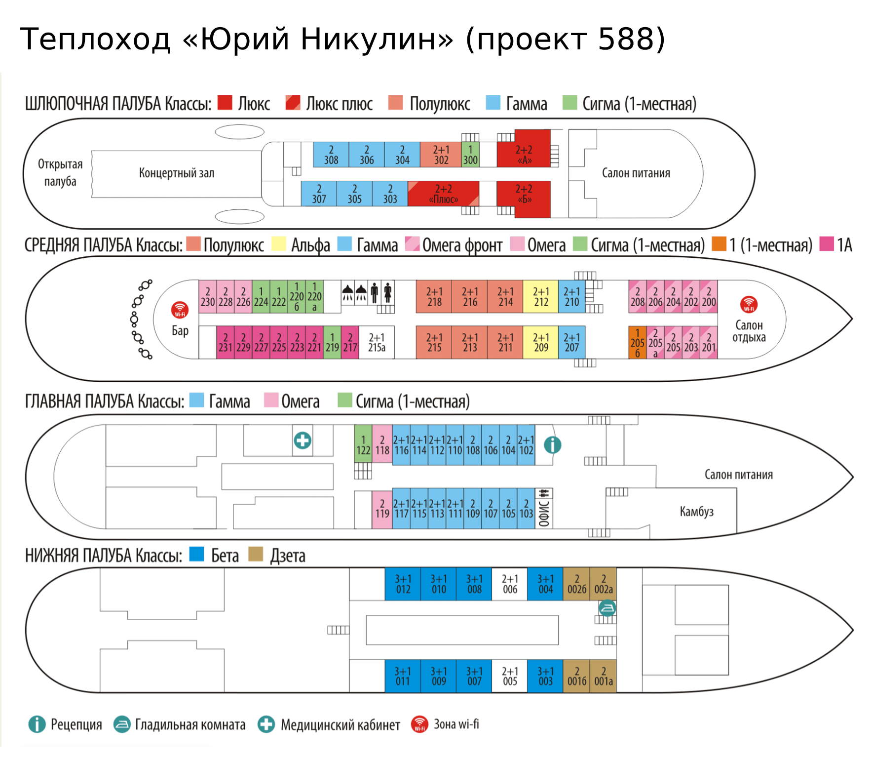 На средней палубе каюты №: 219, 220а, 220б, 222, 224.