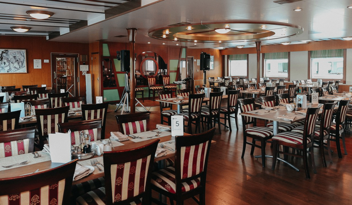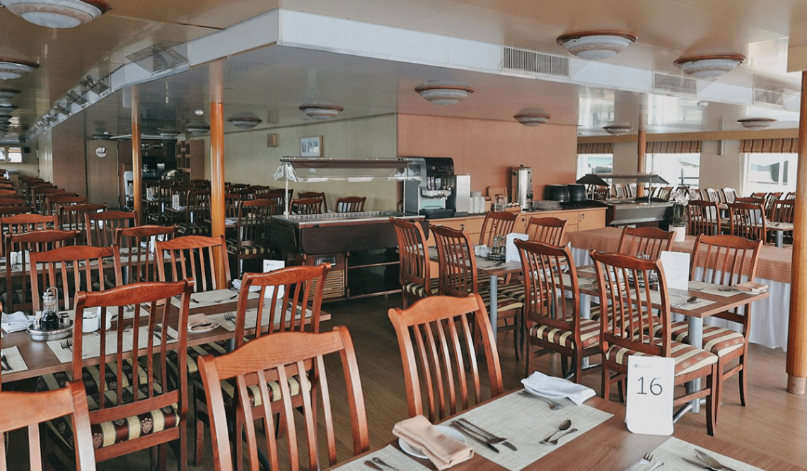 Теплоход является плавучим пансионатом и предлагает следующие услуги: массаж, лечебную физкультуру, фиточай, кислородные коктейли и др. Питание организованно в 2 смены. Завтрак – шведский стол. Обед и ужин – заказное меню.