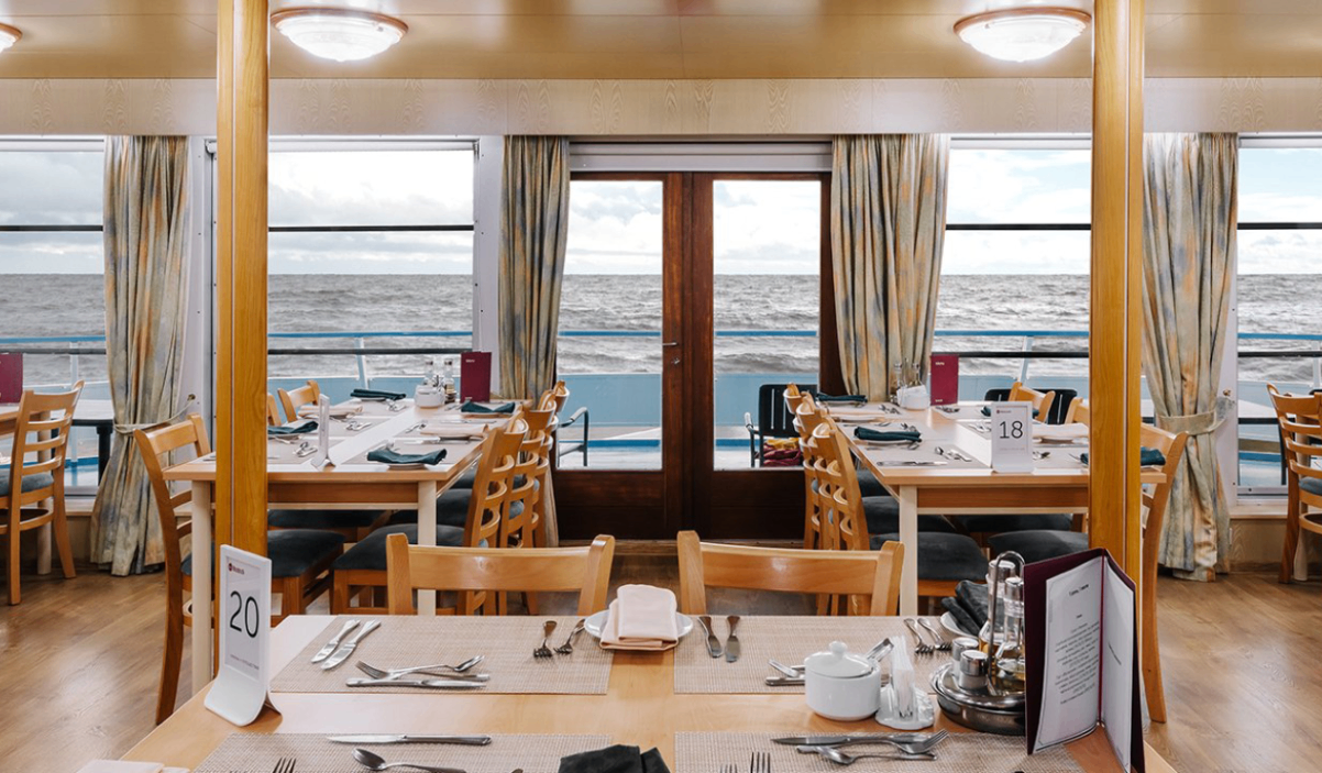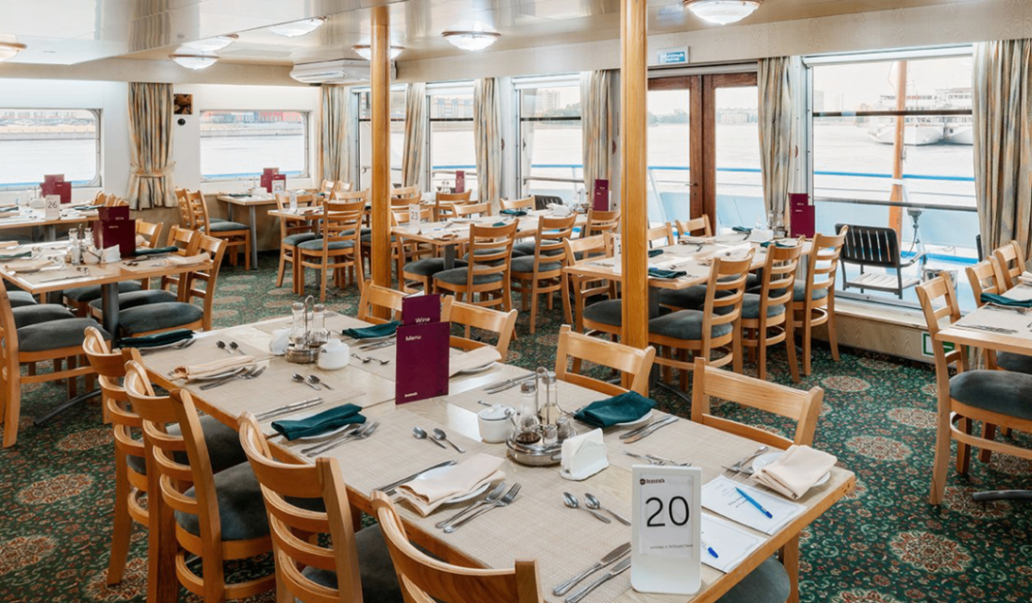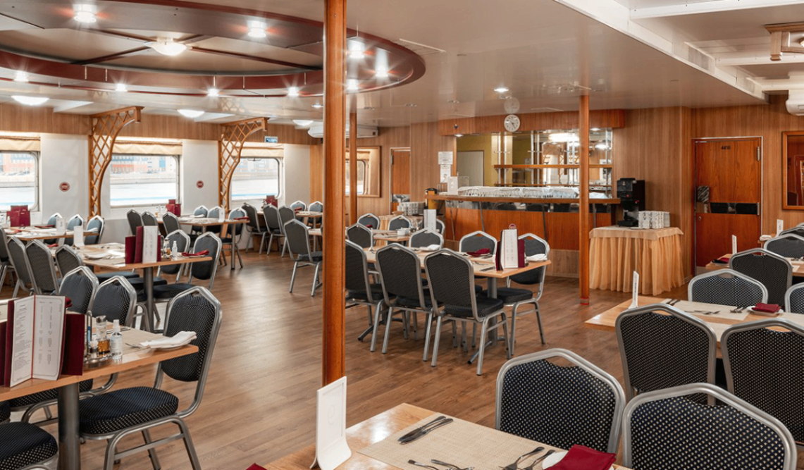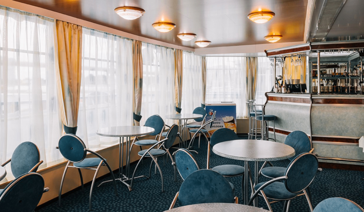 Теплоход является плавучим пансионатом и предлагает следующие услуги: массаж, лечебную физкультуру, фиточай, кислородные коктейли и др. Питание организованно в 2 смены. Завтрак – шведский стол. Обед и ужин – заказное меню.